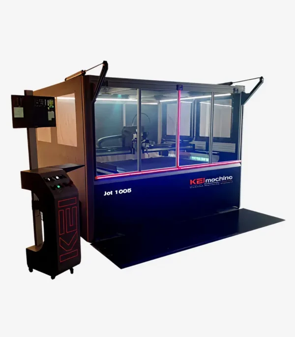 De KEI Jet is een geavanceerde waterstraalsnijmachine die uitblinkt in snelheid, precisie, efficiëntie en modulariteit. Volledig configureerbaar en aanpasbaar aan de wensen van de klant, verwerkt de KEI Jet uiteenlopende materialen en toepassingen, waaronder stansrubber voor stansvormproductie, schuim- en verpakkingsmaterialen tot 250 mm dik, afdichtingen en nog veel meer.